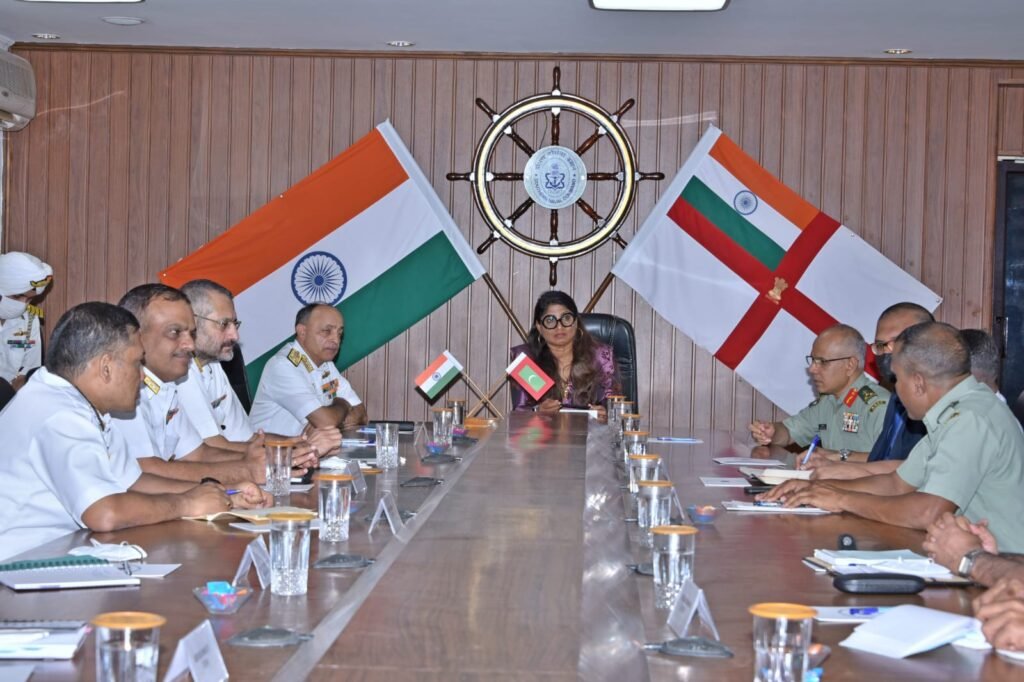 Mariya Ahmed Didi, Honourable Defence Minister of Maldives along with a delegation is on a six days official visit to Kochi and Kannur. The delegation arrived Kochi on 23 Nov 21 and was received by Rear Admiral TVN PRASANNA, VSM, Chief Staff Officer (Training), Southern Naval Command at Cochin International Airport.Vice Admiral AK Chawla, PVSM, AVASM, NM, VSM, ADC Flag Officer Commanding-in-Chief, Southern Naval Command, called on the Defence Minister, Maldives at Headquarters Southern Naval Command on 24 Nov 21.
